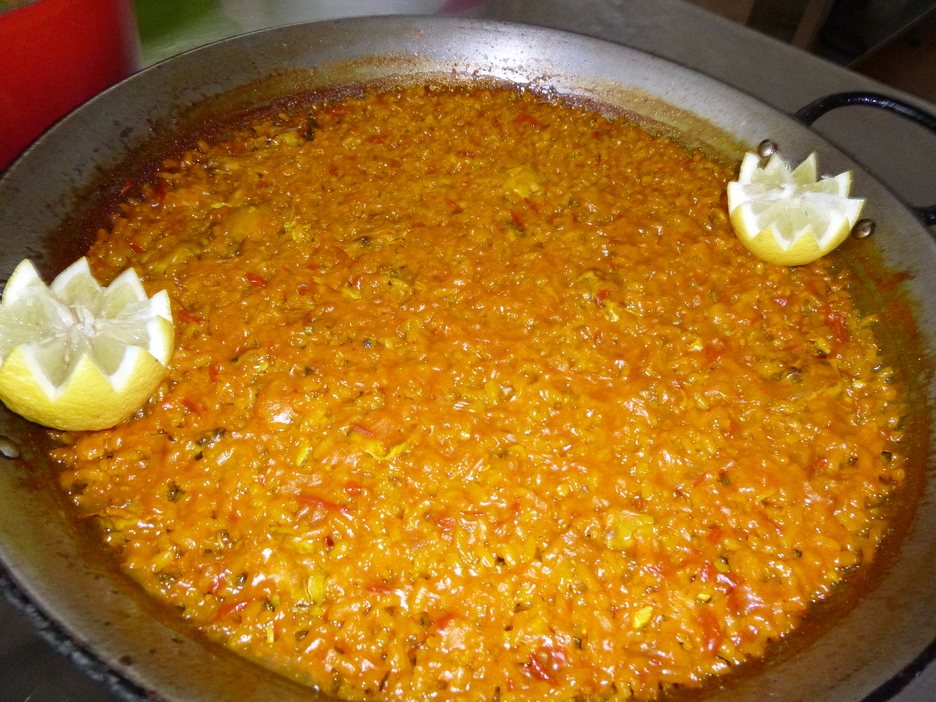 Sofreímos el arroz y añadimos el caldo del mortero y la parte correspondiente de caldo por persona (aproximadamente el doble de caldo que de arroz). Esperamos unos 15 minutos hasta que esté listo.