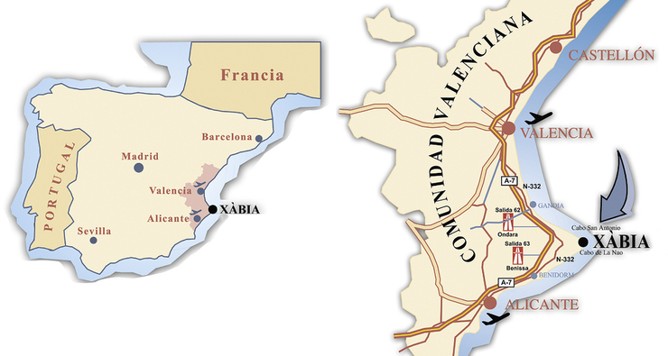 Xàbia es una población costera situada en la Comunidad Valenciana, al norte de la provincia de Alicante y de la Costa Blanca. Es la población más oriental de la comarca de la Marina Alta. El término de Xàbia, rodeado de mar y montaña, está enmarcado por las estribaciones de Les Planes en el Cap de Sant Antoni, al norte, con 167 metros sobre el nivel del mar; al noroeste se halla el Montgó con 753 metros de altura; al oeste se encuentra el amplio valle del río Gorgos que cruza el término de oeste a este, y, al sur, los montes de la Granadella, que se extienden en una plataforma de 200 metros de altitud y el Cap de la Nao.