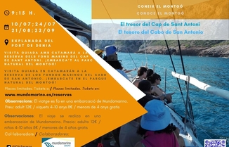 Esta actividad comienza en el Puerto de Dénia las 9:15 h. donde se embarcará en el catamarán de "Mundomarino" que acercará a los participantes a la zona de la Reserva Marina, a lo largo del trayecto de 1 hora aproximadamente, un biólogo del Parque Natural explicará los valores naturales de la Reserva Natural de los Fondos Marinos del Cabo de San Antonio.