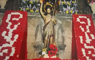 OFRENDA DE FLORES a San Juan, en la Pl. de l’Església, con todos los cargos representativos de los 75 años de Fogueres